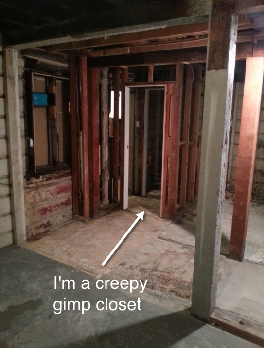 Last weekend I was able to rip out the gimp closet! Not only is this good news because it means that we are no longer obligated to house a gimp, it also means we have a nice and large (feeling) room. Check it out.