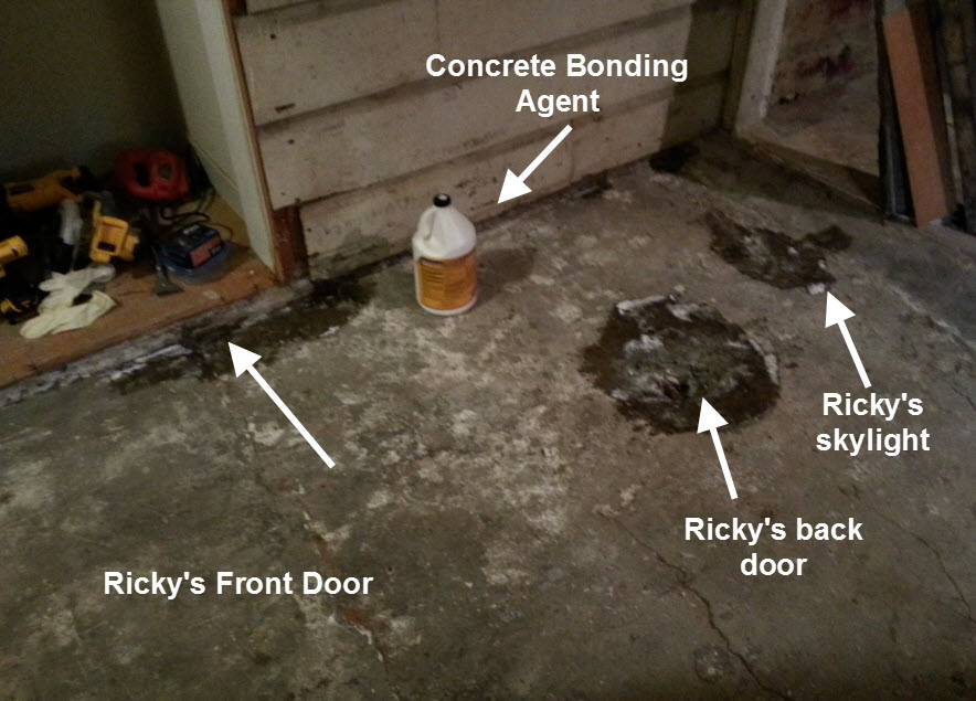 I decided that rather than just building on top of the cracked concrete, I would go ahead and take the extra steps to fill in those holes. I first vacuumed and cleaned the space and then applied a concrete bonding agent. The bonding agent acts like a glue for the concrete. Without it, the concrete would have a hard time sticking to the other concrete in the space.